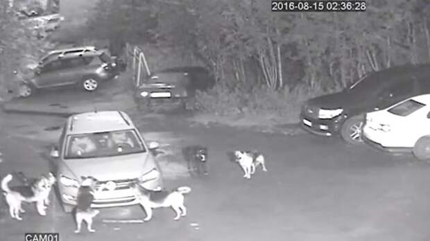 На кадрах ролика видно, как около восьми бродячих собак среди ночи практически окружили внедорожник.