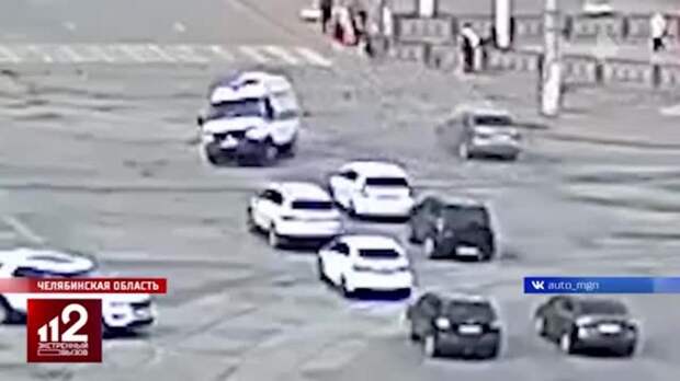 В Челябинской области скорая помощь, которая везла пациента в больницу, попала в аварию. Она выезжает на перекресток с включенными спецсигналами. Поток автомобилей останавливается и пропускает бригаду. А вот водитель серебристой иномарки, который мчался в правом ряду на высокой скорости, не ожидал, что на пути у него возникнет препятствие.