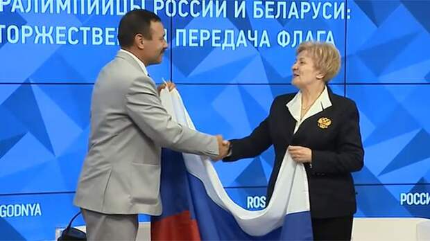 Начальник отдела зимних видов спорта Министерства спорта Белоруссии Андрей Фомочкин передал России тот самый флаг, который пронес в поддержку российских паралимпийцев на церемонии открытия Паралимпиады в Рио.