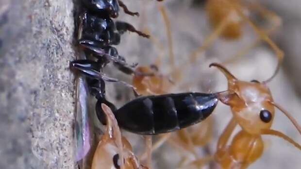 Кадр из программы "Как устроен мир", РЕН ТВ "Слизь эта очень токсичная и липкая – и она убивает, ну, какое-то другое насекомое или того, кто хочет ворваться в их колонию. В итоге сам муравей тоже погибает. Тем самым он защищает свою колонию от вредителей", – пояснила биолог Дмитрова.