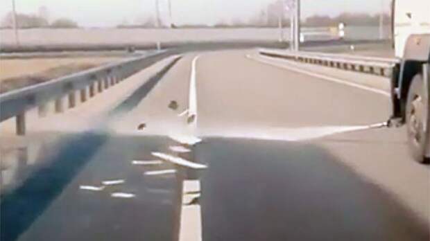 В Сети появился ролик, снятый видеорегистратором, на котором запечатлено, как поливомоечная машина очищает трассу. По предварительным данным, запись была снята в Ленобласти на автодороге под Петербур7гом.