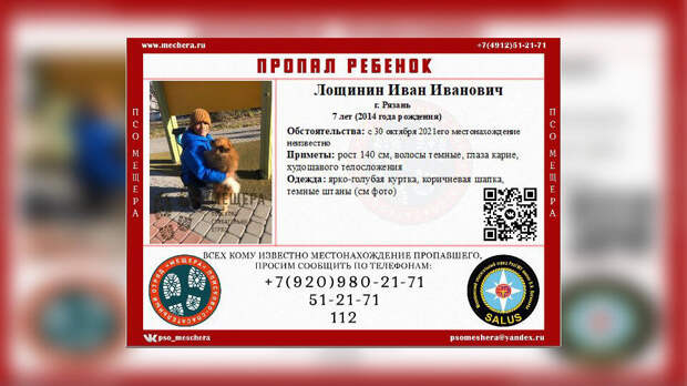 В Рязани пропал семилетний мальчик. Ребенка не могут найти с утра 30 октября, сообщает поисково-спасательный отряд "Мещера".