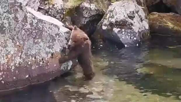 Сотрудники Кроноцкого государственного заповедника опубликовали видеозапись, на которой маленький медвежонок ищет свою маму. Во время ее поисков малыш впервые заставил себя залезть в воду, что ему не очень понравилось.
