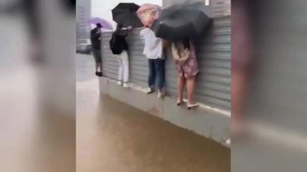 Во время грозы и сильного ливня в Москве горожанам пришлось забраться на временное строительное ограждение, чтобы пересечь улицу.