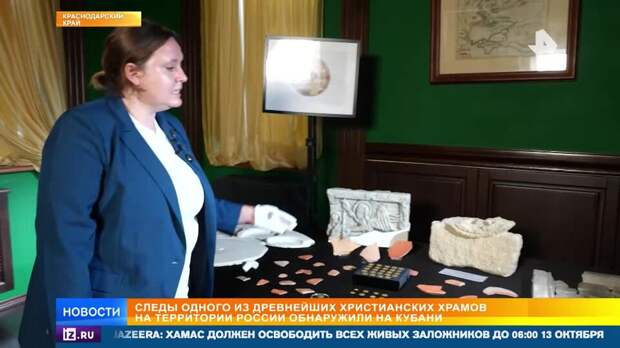 "Эти артефакты – не просто экспонаты, а вещественные доказательства давно ушедшей эпохи. Вот например, бронзовый крест от лампады и сигмовидный стол, которые были частью утвари раннехристианского храма, который стоял здесь полторы тысячи лет назад", – сообщила корреспондент.