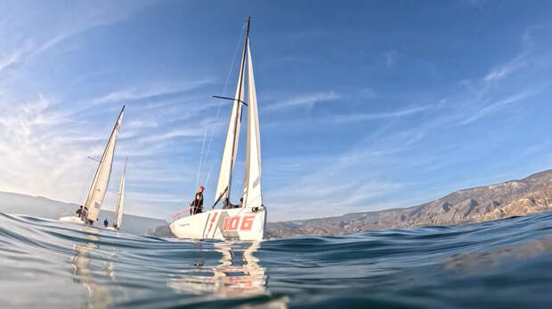 Яхты идут лавировкой, смена галса, резкий порыв ветра. Спортсмены отдают команды, кто-то помогает вытягивать генакер. Это атмосфера настоящей регаты.