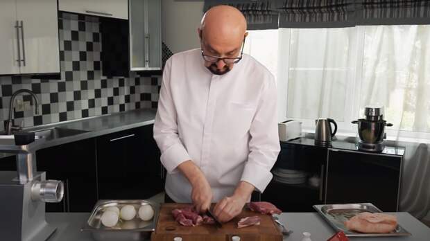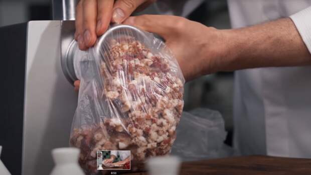 Замороженное накануне мясо разрезаем на куски — такие, чтобы их можно было опустить в мясорубку еще раз. Сталик Ханкишиев обращает внимание, насколько хорошо проходит через инструмент замороженный фарш, не теряя ни капли сока. Казалось бы, кристалликами льда мы разорвали всю оболочку, и сок должен вытечь. Но фарш сухой, будто из хлеба. Пропускаем через мясорубку дважды, используя крупную и мелкую насадки.