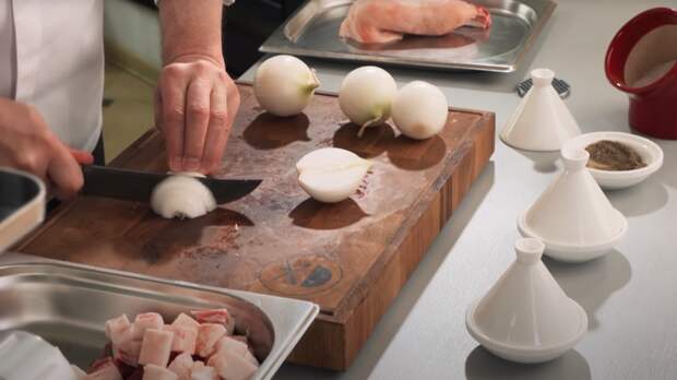 Лук нарезаем полукольцами среднего размера. Примерно так же, как если бы вы резали лук, чтобы замариновать шашлык. Необходимо посолить лук — легче отжать сок. Крупинки соли нарушают структуру волокон, сок и бежит. Он подмаринует мясо и сделает его вкуснее. Многие повара отжимают сок, оставляя лишь луковый жмых, и с луковым жмыхом готовят блюдо. По словам Сталика Ханкишиева, это ошибка тех, кто не понимает, что такое настоящий люля-кебаб.