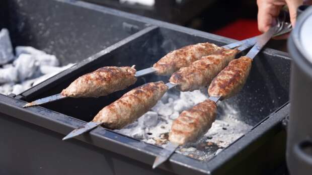 Смачиваем руки в воде. Фарш должен прилипнуть к шампуру, а не к рукам. Берем в руку примерно 100 граммов фарша. Гиждуванский кебаб не готовится слишком большим. Придаем кебабу плоскую форму. Готовится на мангале он будет с двух сторон, а не с четырех. Как правило, фарш для люля-кебаба очень сильно вымешивают, но эту работу за нас сделали мороз и мясорубка. На каждый шампур приходится по две котлеты. Начинаем с сильного жара, переворачиваем каждые 15-20 секунд. Не нужно ждать, чтобы появился характерный кипящий звук или первый дымок. Мясо чуть изменит цвет — и переворачиваем. Мясо должно прогреться равномерно и быстро. Необходимо, чтобы белок внутри мяса схватился, и фарш не протек вниз.