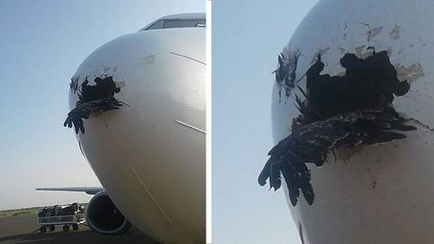В сети появился снимок самолета авиакомпании Tarco Air, который совершил аварийную посадку недалеко от пункта своего назначения из-за столкновения с птицей. Пернатый, которого на данный момент называют "орел", столкнулся с носом самолета, когда тот уже заходил на посадку в городе Эль-Фашир, сообщает Daily Mail.