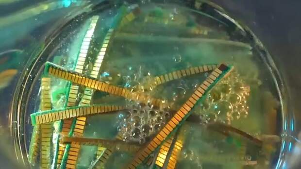Самое большое количество золота содержится в контактах. Чтобы отделить драгоценный металл от электронных плат, контакты срезаются, помещаются в стакан и заливаются азотной кислотой.