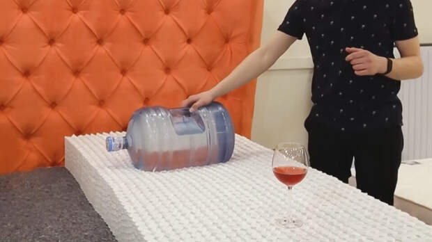 Кто-то скажет: подумаешь, три килограмма. В реальной жизни матрас испытывает гораздо большие нагрузки. Что ж, изменим условия эксперимента. Вместо легкой гантели возьмем тяжелую бутыль с водой. А красненькое трогать не будем.