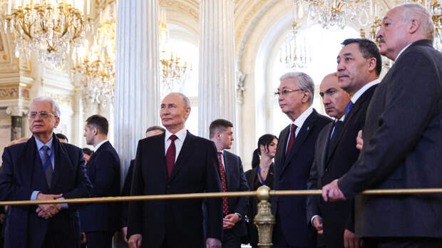 Президент Казахстана Касым Жомарт Токаев, окончивший МГИМО, хорошо знаком с русской культурой. Позже к экскурсии присоединяется Александр Лукашенко. Уже в Георгиевском зале деловое общение.