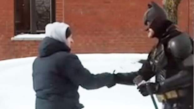 В Сети набирает популярность видео, на котором мужчина в костюме Бэтмена помогает жителям канадского Монреаля справиться с классическими зимними проблемами.