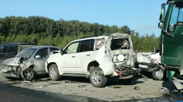 Сразу 12 машин столкнулись под Новосибирском. Очереди из разбитых авто собрались на обеих сторонах трассы. Посреди этого "паровоза" оказался и многотонный грузовик. Он практически смял половину внедорожника.