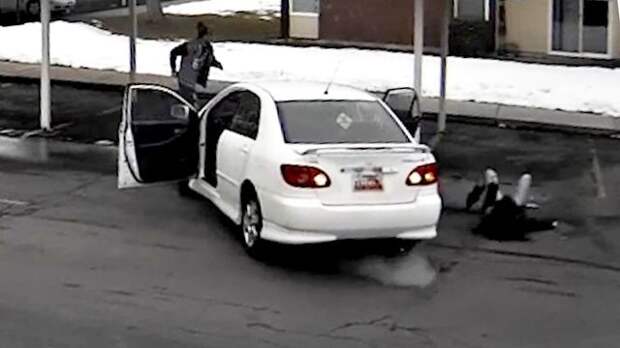 На кадрах опубликованного в Сети видно, как к стоящей с открытыми дверями машине подбегает преступник и, несмотря на сопротивление находившихся поблизости хозяев, дерзко угоняет авто прямо у них на глазах.