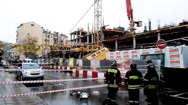 Журналисты РЕН ТВ публикуют видео с места падения крана в центре Москвы.