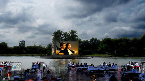 Экран и звукоаппаратуру установили на небольшом острове посреди искусственного озера.