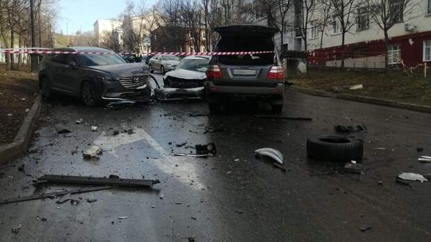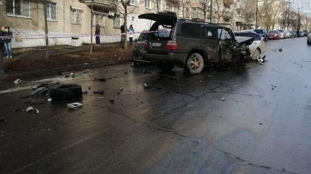 От столкновения автомобиль "Рено" совершил опрокидывание, продолжив неконтролируемое движение, автомобиль "Тойота Лэнд Крузер" допустил столкновение с автомобилем "Тойота Аксио" и двумя припаркованными автомобилями "Мазда" и "Тойота Рав 4".