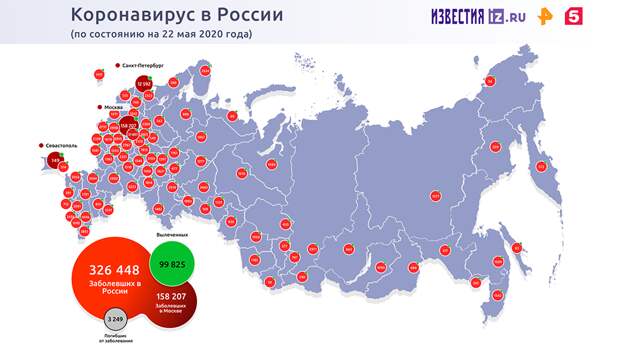 За последние сутки в России выявили 8894 новых случая COVID-19. Всего в стране коронавирус обнаружили у 326 448 человек. У около половины пациентов, сдавших положительный тест на коронавирус, нет клинических проявлений болезни (доля бессимптомного течения заболевания составляет более 40%). По состоянию на 22 мая, от осложнений, вызванных коронавирусной инфекцией, на территории РФ скончались 3249 человек, 99 825 выздоровели.