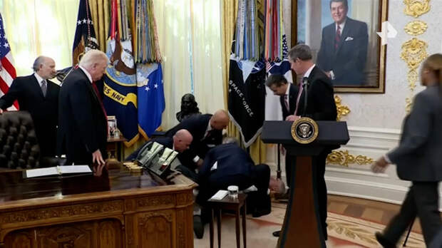 Гость Овального кабинета потерял сознание в присутствии самого Трампа и других первых лиц страны и отрасли.Один из присутствующих, доктор Мехмет Оз, бросился мужчине на помощь. На запись попали взволнованные вопросы к упавшему, после чего трансляция прервалась.