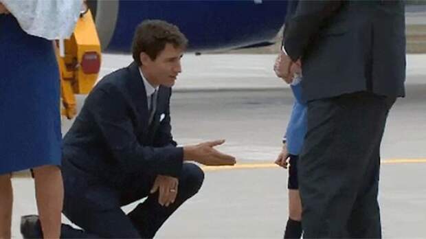 После того как Трюдо поприветствовал родителей принца, он встал на одно колено перед Джорджем и дважды предложил ему пожать руку. Однако ответного жеста так и не дождался. Маленький принц прятался за ногу отца и отрицательно качал головой.