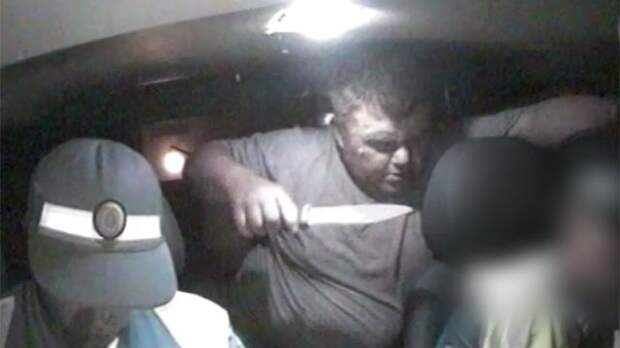 На них видно, как дорожные инспекторы составляют протокол, а сидящий сзади Иван Трусов абсолютно спокоен. Но затем внезапно нарушитель достает нож и набрасывается на стражей порядка. Полицейским Александру Лямкину и Роману Польникову преступник нанес множественные удары.