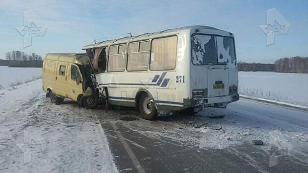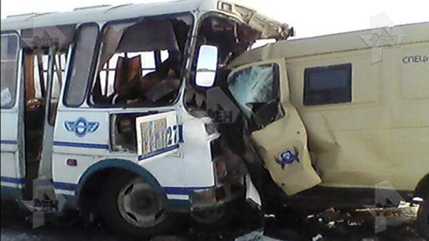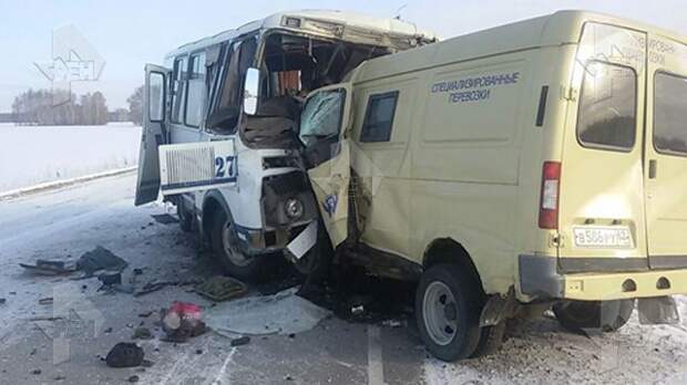 Опубликованы первые фотографии с места страшного ДТП в Омской области. На трассе столкнулись инкассаторская машина и пассажирский автобус.