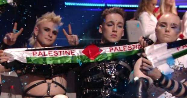 Исландская группа весь вечер красовалась в шарфах цвета палестинского флага и с надписью Palestine.