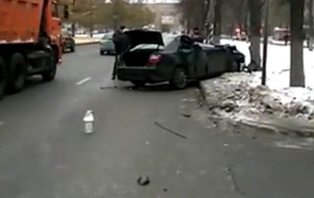 От удара авто отлетело в дерево и превратилась в груду металла.