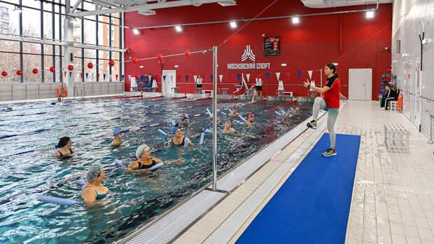 В спорткомплексе, который возвели по просьбе жителей, есть два бассейна – для взрослых и для детей – а также зал для групповых занятий. Там уже начались групповые занятия по плаванию и аквааэробике.
