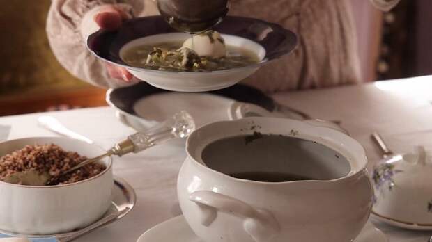 В качестве обеда Владиславу Рябову предложили зеленые щи с яйцом пашот на говяжьем бульоне. На стол всегда подавался свежий домашний хлеб.