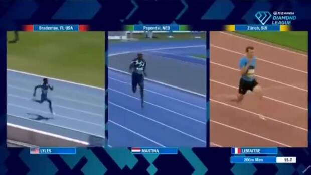 Американский спринтер Ной Лайлз "побил" на 200-метровке мировой рекорд ямайского спортсмена Усэйна Болта (19,19 секунды). Он пробежал дистанцию за 18,91 секунды, что вызвало восторг и удивление комментатора.