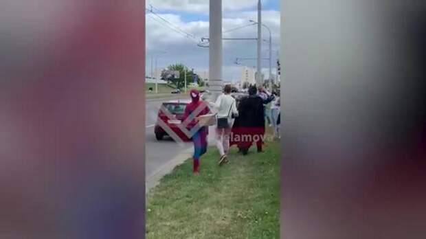 В Минске два человека в костюмах супергероев привезли протестующим в Белоруссии воду и снеки. Видео с акции протеста появилось в соцсетях.