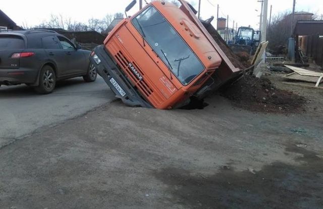 Под Иркутском КамАЗ провалился в огромную яму на дороге. Грузовик должен был засыпать яму песком.