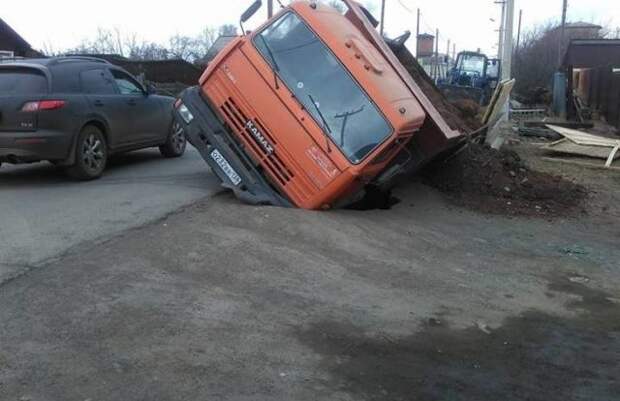 И вот наконец в апреле 2017-го года местные власти приступили к ликвидации провалов. Одну из ям спецтехнике удалось засыпать, а во вторую провалился КамАЗ. Достать машину получилось спустя два часа при помощи экскаватора.