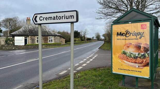 McDonald's снимет рекламу своих гамбургеров McCrispy, которая висит у входа в крематорий Пенмаунт в американском города Корнуолл. Решение приняли после общественного резонанса. Об этом пишет CornwallLive.