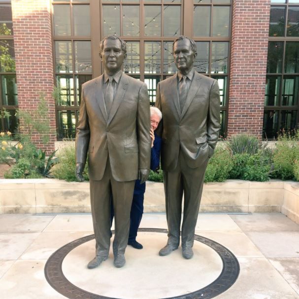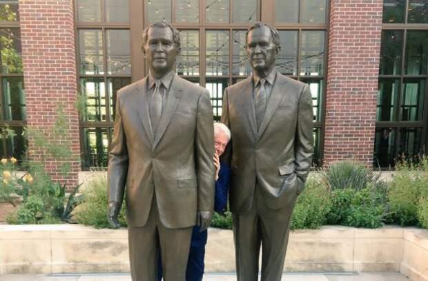 Пресс-секретарь 42-го президента США Билла Клинтона Энджел Уренья опубликовал в своем Twitter фотографию, на которой Клинтон запечатлен спрятавшимся между статуями Буша-старшего и Буша-младшего. Публикацию, которая сразу начала набирать популярность у пользователей, Уренья дополнил подписью: "Все больше в Техасе! "