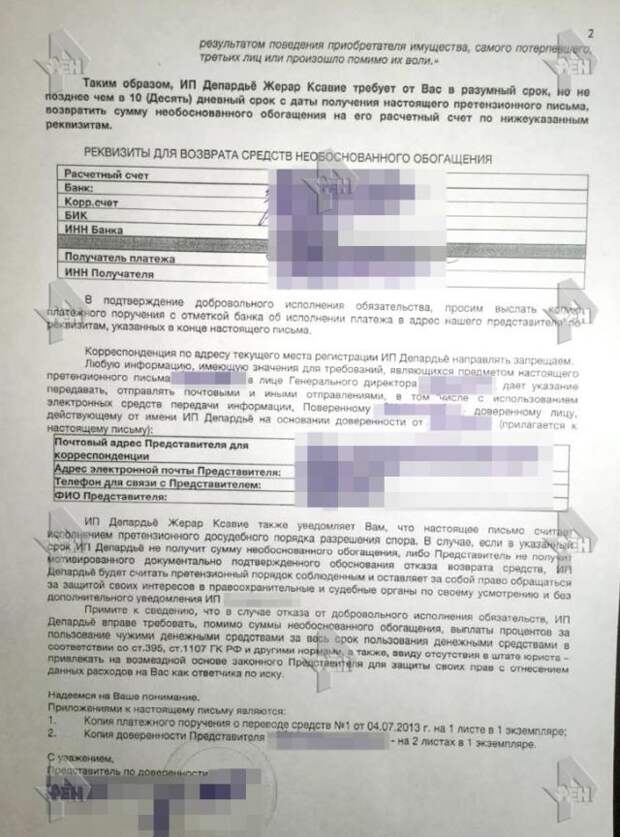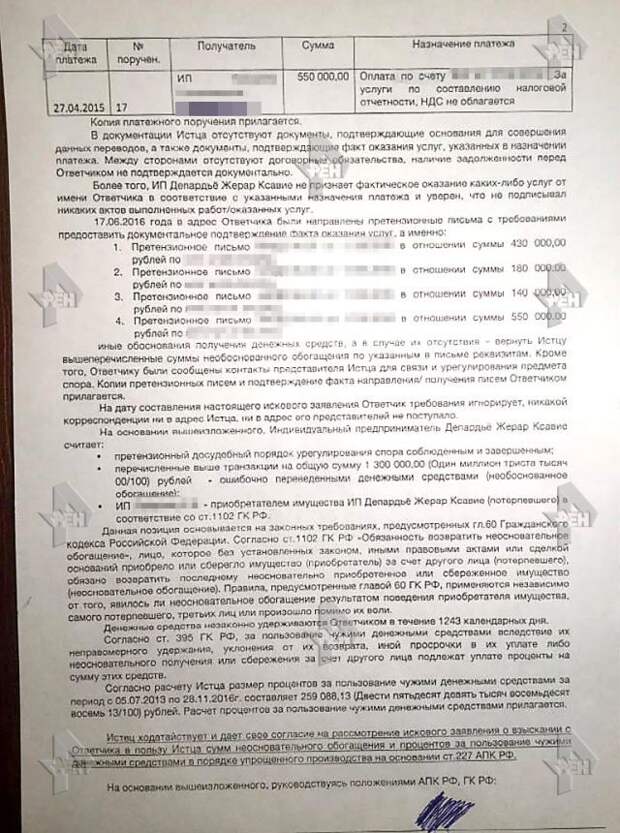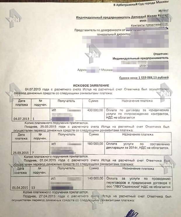 Ранее в распоряжении РЕН ТВ оказались документы, которые проливают свет на претензии актера к российской предпринимательнице. В них, в частности, говорится о произведенных в период с 2013 по 2015 год неподтвержденных транзакций со счета Депардье за юридические услуги, якобы оказанные последнему фирмой Лазаревой ООО "ГлавБухАудит". Сам Депардье заявил, что никаких актов об оказании услуг не подписывал, а списания с его счета незаконны.