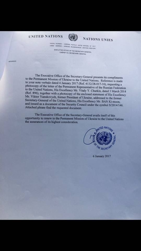 Он отметил, что власти Киева получил от секретариата ООН копию письма бывшего президента с просьбой ввести в страну войска.