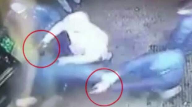Затем один из нападавших вытаскивает на улицу охранника бара.
