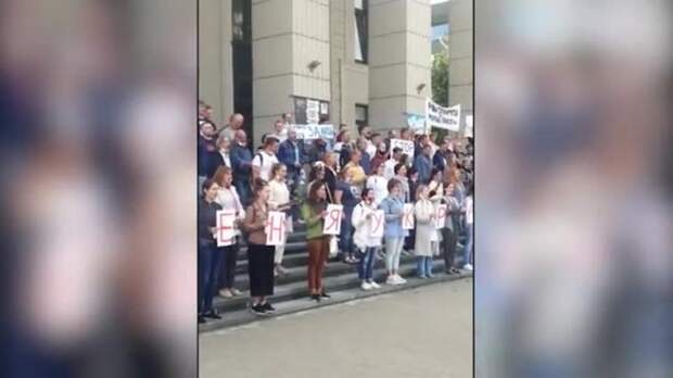 На кадрах видно десятки людей, стоящих на ступеньках у входа. Они держат плакаты с текстом "У меня украли голос".