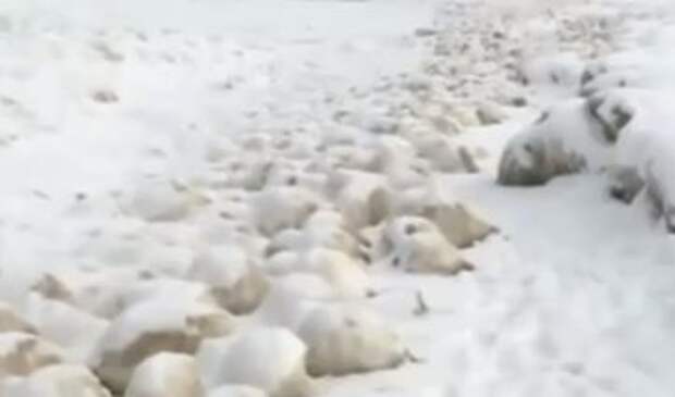 Десятки снежных шаров плещутся в волнах у берега и производят странное впечатление.Стали даже говорить, что так леденеют камни. Но специалисты заверяют, всё это обычное дело - просто именно так может замёрзнуть солёная вода, а ледышки катает ветер, превращая их в абсолютно гладкие шары.