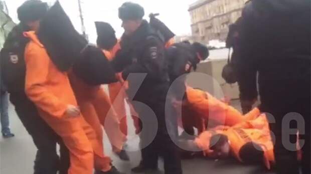 Сотрудники полиции задержали участников акции протеста у посольства США в Москве. 10 человек в оранжевых робах Guantanamo легли на землю и сковали себе руки и ноги наручниками.
