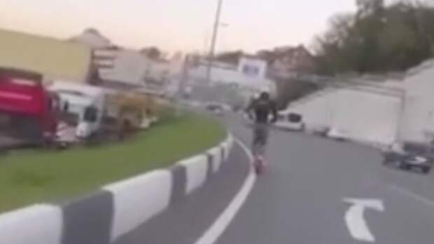 Мужчина для безопасности надел защитные наколенники и шлем, однако при падении на такой скорости они явно не спасли бы его от тяжелых травм. Не говоря уже о том, что лихач вообще мог угодить под колеса машин. Но, к счастью, в этом случае все обошлось.