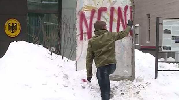 Нардеп Верховной рады Алексей Гончаренко разрисовал фрагмент Берлинской стены после заявлений посла Германии Эрнста Райхеля, поставившего под сомнение правомерность заявлений властей Киева о невозможности проведения выборов в Донбассе в нынешних условиях.