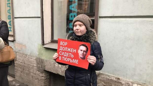 Собравшиеся демонстрируют плакаты с фотографией Навального, которые сопровождаются направленными против оппозиционера подписями.