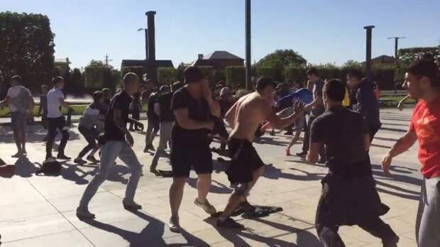 Фанаты "Анжи" устроили массовую драку в Краснодаре. Очевидцы выложили видеозапись инцидента.