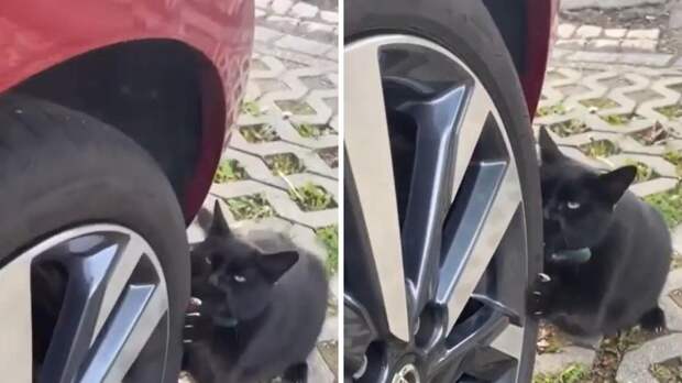 На коротком ролике видно, как черный кот подходит к припаркованному автомобилю и начинает усердно точить когти о колесо.