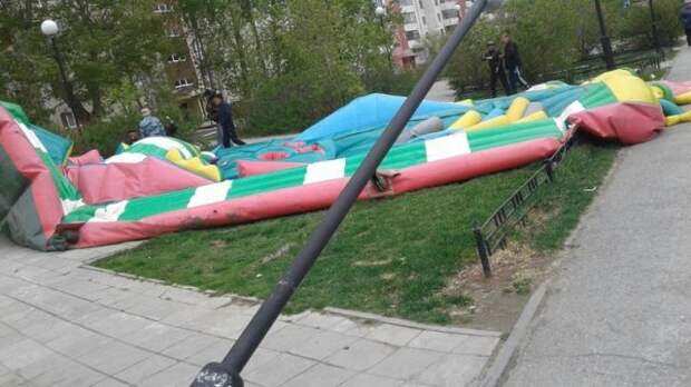 Очевидцы также выложили фото с места происшествия в социальных сетях. На снимках видно, что батут повален на землю.
